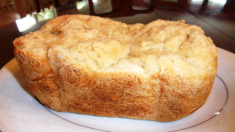 Été 2011:  bonne nouvelle.  J’ai enfin résolu le problème de trop grande humidité de ce pain depuis que la température extérieure est plus humide.  J’ai simplement utilisé 350 ml d’eau au lieu de 375.  Mon pain est meilleur et plus beau que jamais.  Même le dessus du pain  au lieu d’être plat est maintenant joliment bombé. Ce pain est même alvéolé. N.B.: il est fait avec la compote de pommes au lieu des oeufs puisque je ne tolère ces derniers qu’occasionnellement.  J’ai appris dernièrement que la farine de riz absorbe l’eau beaucoup plus que les autres farines.  C’est pourquoi le niveau d’humidité dans l’air affecte ce type de pain.
