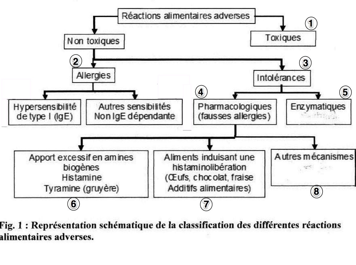 En ce sens, il faut retenir qu’une personne sur trois  dit être au prise avec des réactions alimentaires adverses alors que ce phénomène n’est prouvé que chez seulement 2% de la population.  En fait, une réaction adverse à un aliment ne veut pas dire nécessairement allergie à cet aliment mais pourrait entrer dans la catégorie « intolérance » correspondant aux nos 3-8 du tableau.