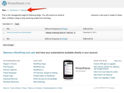 La page de gestion des souscription de WordPress s’affichera dans votre fureteur, malheureusement cette page est en anglais seulement. Vous devez maintenant aller à la page de configuration en cliquant sur le mot « Settings » tel qu’illustré dans l’image suivante.