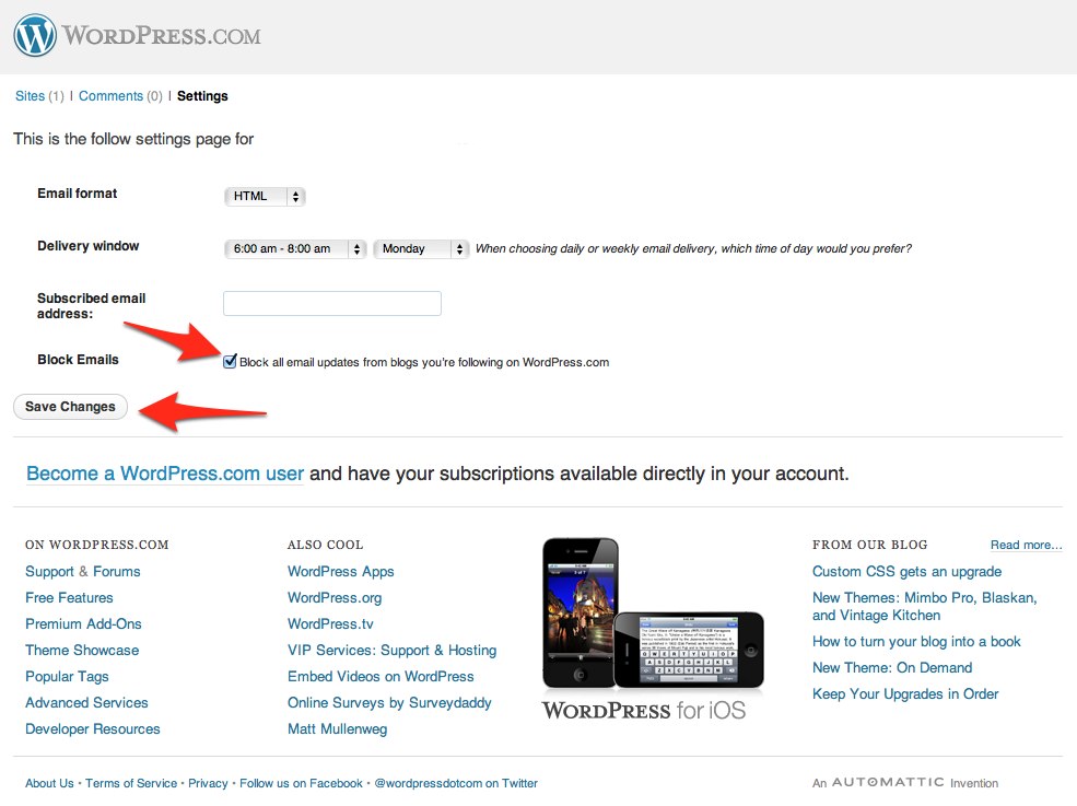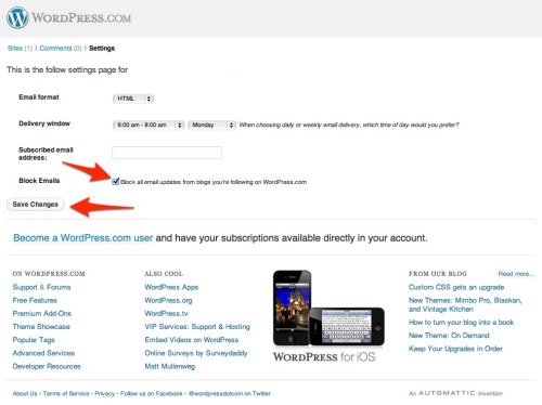 Dans la page de configuration vous devez cocher l’option « Block Emails » en cliquant sur la case à cocher, puis enregistrer votre changement en cliquant sur « Save Changes » tel qu’illustré dans l’image suivante. À partir de ce moment vous ne recevrez plus de courriels de WordPress.